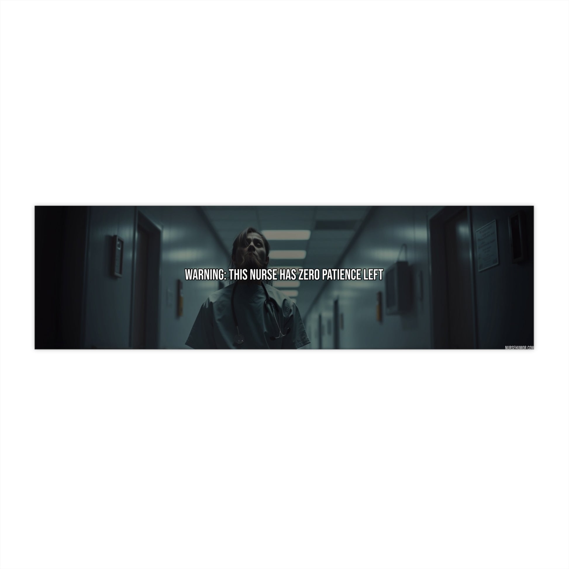 Warning This Nurse Has Zero Patience Left — Premium vinyl bumper sticker. 11" × 3". UV-resistant, waterproof, car-wash safe. 🐾 10% to no-kill shelters.